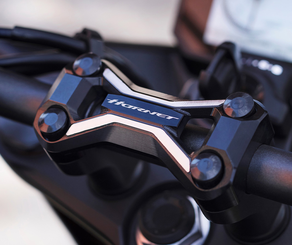 The fuel tank, which is the primary distinguishing feature of the Hornet, is designed to resemble a hornet's wing. There are signs of tension and ferocity wherever you look, underlining true sports intent, from the sharply slanted nose fairing to the razor sharp, minimum tail. The design is also inherently usable for all riders. The riding stance is upright with somewhat rear set foot pegs for natural control and wide handlebars for leverage. Seat height is a very manageable 795mm.