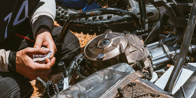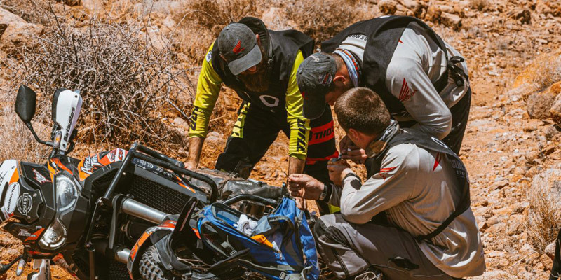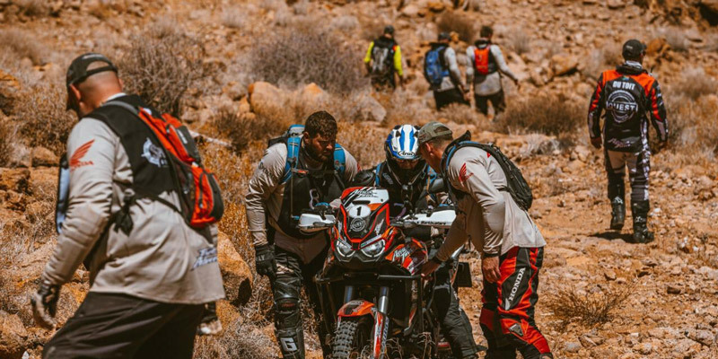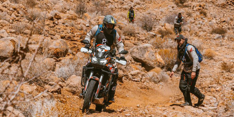 Next up was “staircase to heaven”, a rutted narrow loose switchback climb with steep drop-offs for the unwary. The challenge was made more difficult when an Instructors bike picked up a slight case leak from a meeting with a boulder in the trail hitting the crash bar with enough force to bend it into the case. This unexpected issue created a new team test when the recovery and repairing of the bike was made the contestants’ responsibility to be observed under the watchful eyes of the instructors. They pulled it off fantastically.